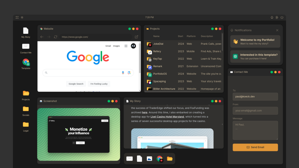 PortfolioOS is a unique and innovative portfolio template designed to give your personal or professional portfolio the look and feel of a modern operating system. Perfect for developers, designers, and creatives, PortfolioOS offers an interactive and engaging way to showcase your work and skills.