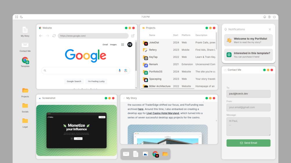 PortfolioOS is a unique and innovative portfolio template designed to give your personal or professional portfolio the look and feel of a modern operating system. Perfect for developers, designers, and creatives, PortfolioOS offers an interactive and engaging way to showcase your work and skills.